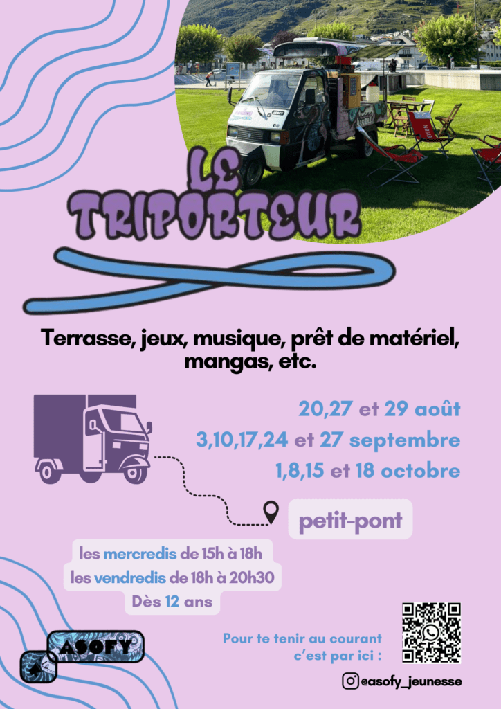 Avec son triporteur, l’équipe d’animation socioculturelle se déplace, selon les besoins des jeunes, dans les différentes régions de Fully où ils se rencontrent. Il est ainsi possible de voir notre véhicule sur la place du Petit-Pont, puis au terrain multi-sports du cycle ou encore dans la cour d’école de Saxé. Le triporteur se transforme alors en un espace de rencontres, d’échanges et de création de projets.