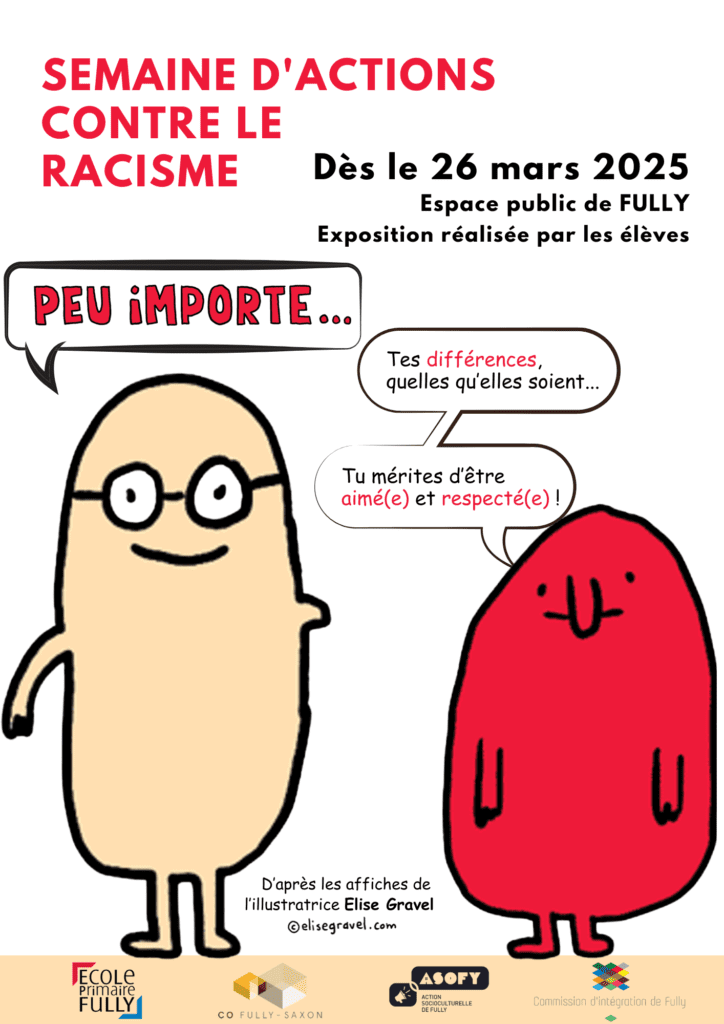 À l’échelle de Fully, un des objectifs recherchés par la commission et l’AsoFy est de sensibiliser la population de Fully à la problématique du racisme. De ce fait, elle participe à la semaine internationale contre le racisme. Un groupe de travail spécifique travaille sur l’élaboration de projet. Ainsi, elle met en place une action ludique, récréative en intégrant différents partenaires dont prioritairement les élèves des écoles primaires (1H à 8H).