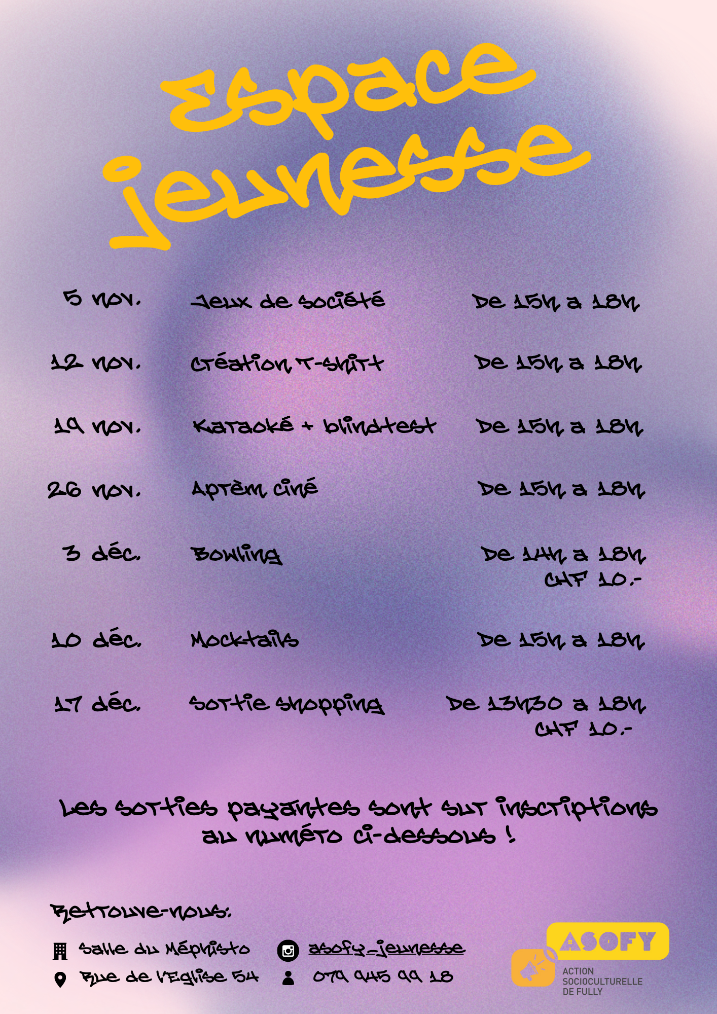 Dans la continuité du projet de la Plateforme Ados, l’Espace Jeunesse offre aux jeunes de Fully la possibilité de se retrouver dans la salle du Méphisto pendant l’hiver pour se rencontrer et profiter du matériel à disposition.
